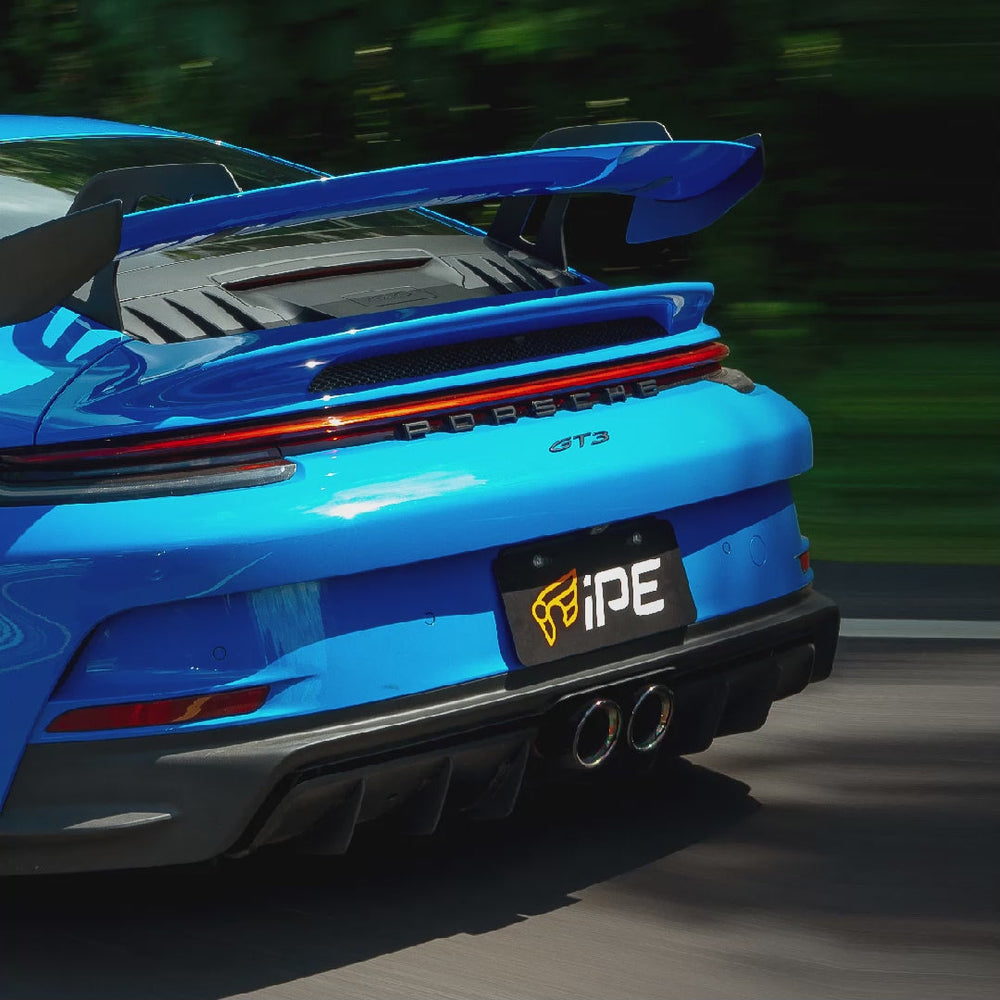 IPE Exhaust for Porsche 992 GT3. The iPE Catback Exhaust System for the Porsche 992 GT3 with or without OPF is designed and engineered to bring joy to every second in the cockpit. This iPE exhaust system is a direct bolt-on system in Titanium, reducing maximum weight by 40%(-5.8kg). Overall, providing significant enhancements in handling, throttle responsiveness and power curve all the way to redline.