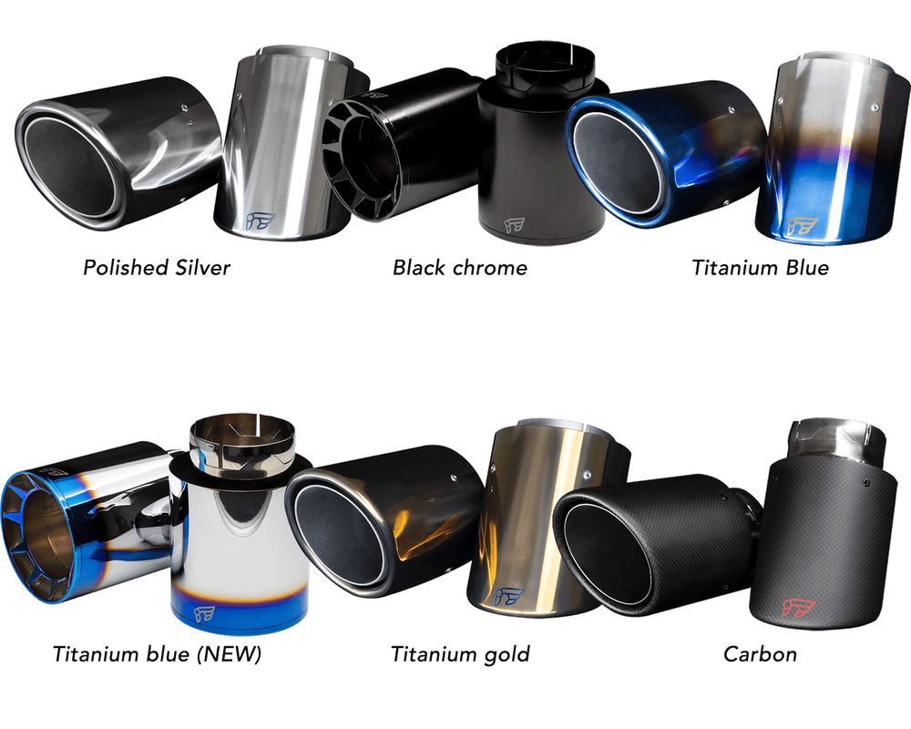 Standard equipped with Chrome tailpipes, optionally available with Carbon fiber, Chrome black, titanium blue or titanium gold tailpipes.
